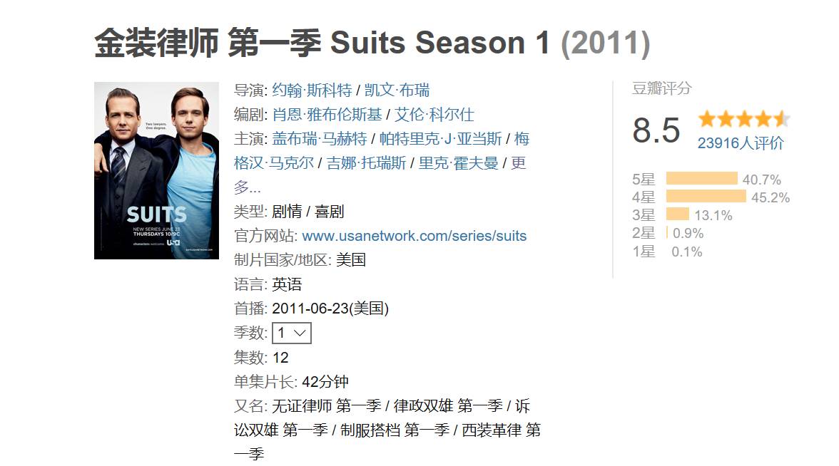 豆瓣评分也是相当出彩的,第一季为8.5分。